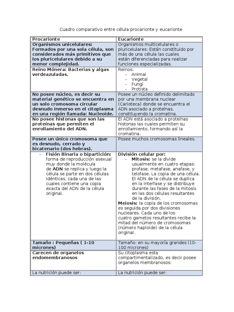 Cuadro comparativo entre célula procarionte y eucarionte .