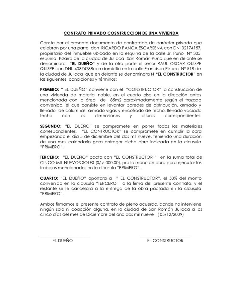 Contrato privado para la construcción de una vivienda .