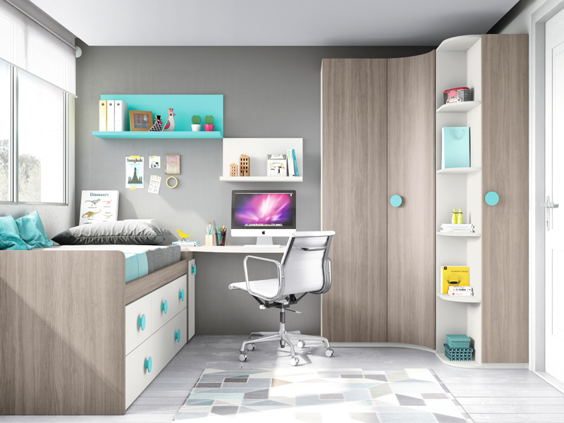 Dormitorio juvenil con cama compacta y armario rinconero .
