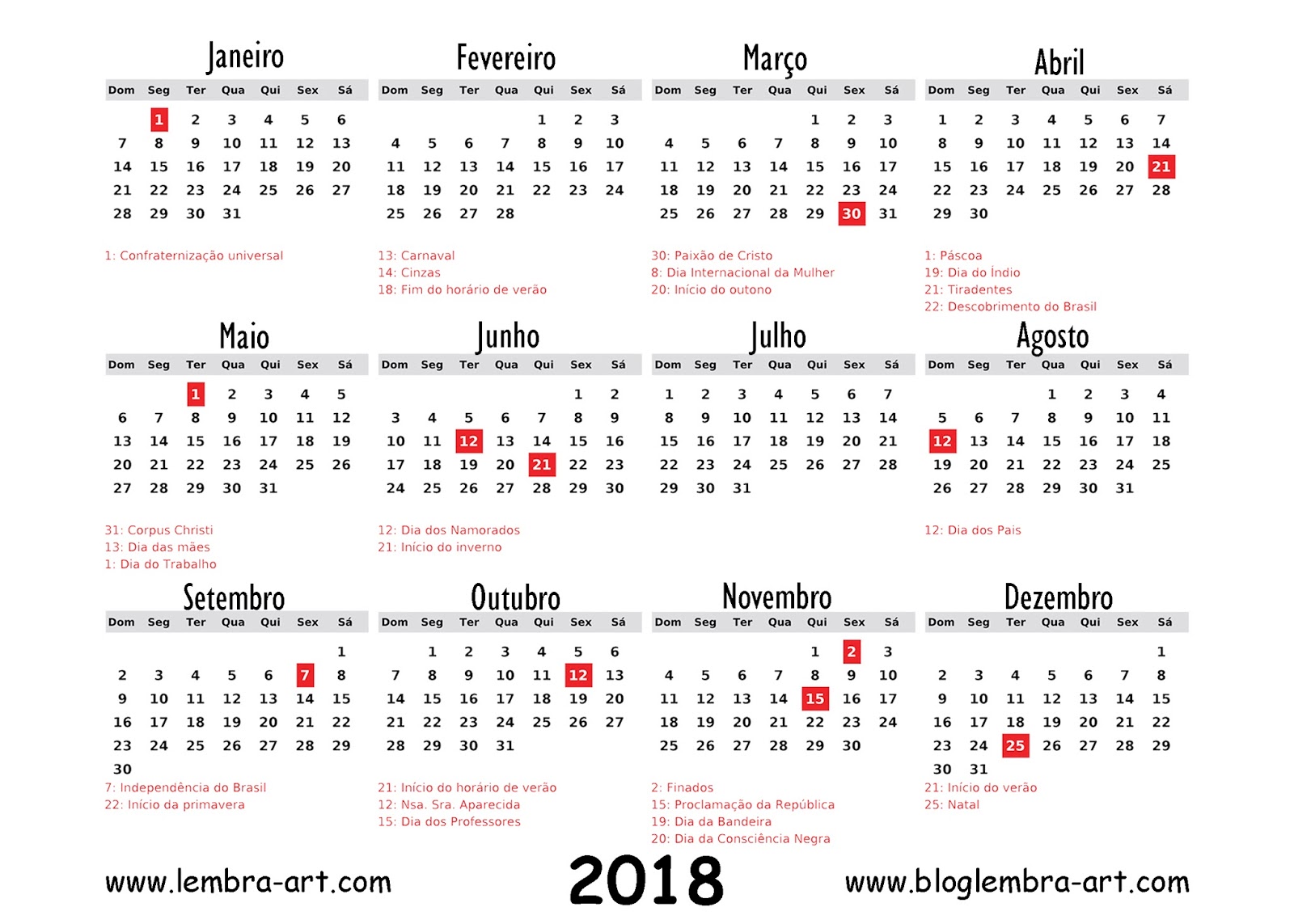 Lembra-Art Produções: Calendario 2018 para imprimir .