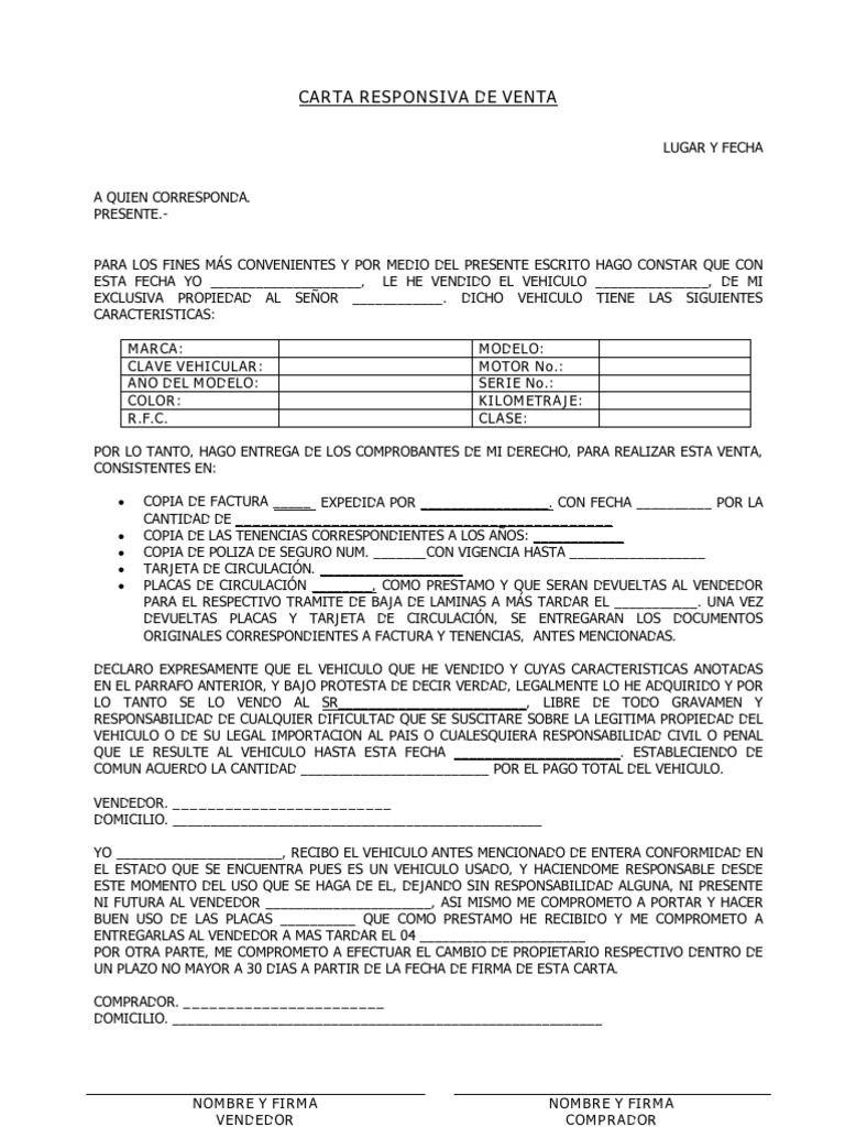 Ejemplo De Carta Responsiva De Compra Venta De Auto ... .