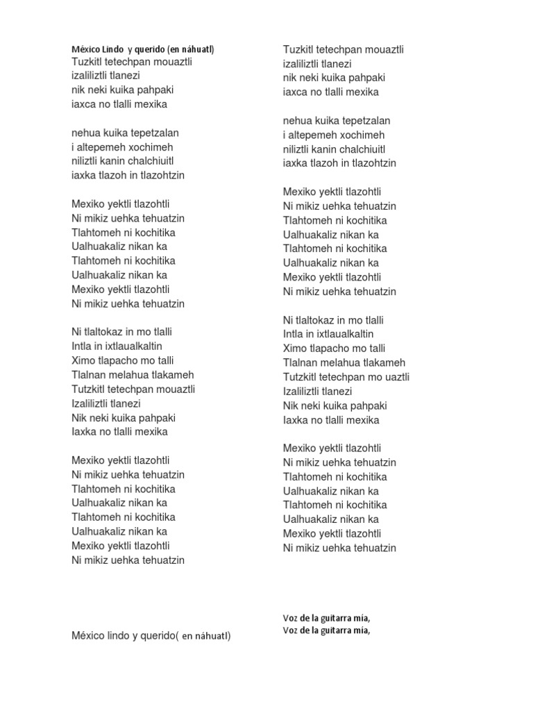 Letra en Nahuatl de Mexico Lindo y Querido .
